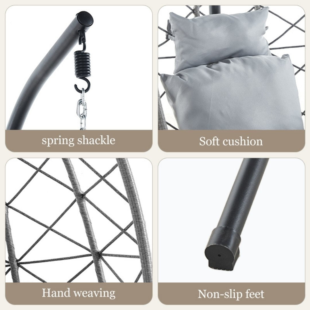 Key Features Material: PE rattan weave with powder-coated steel frame Design: Egg-shaped hanging chair with soft cushion and headrest Finish: Neutral tones for versatile styling Use: Ideal for patios, gardens, balconies, or indoor nooks Comfort: Includes thick seat cushion and back pillow Assembly: Easy to assemble with included hardware Care: Wipe clean; store under cover during heavy rain