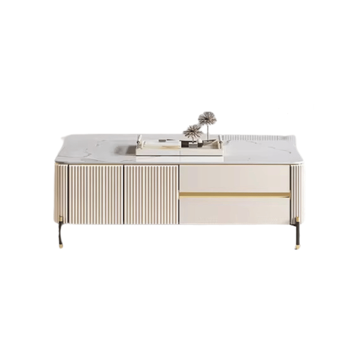 Fluted High Gloss Wooden Panels with Gold Legs & Marble Look Top