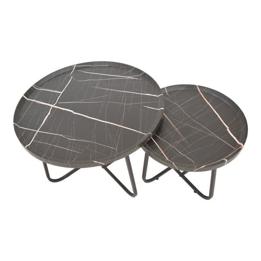 Elevate your living space with the Nero Nesting Marble-Top Coffee Table Set, a stylish and space-saving solution for modern interiors. This elegant 2-piece set features black round tops with striking marble-effect veining in white and gold tones, perfectly balanced with sleek black metal frames. The smaller table nests seamlessly beneath the larger one, offering flexible functionality and a bold aesthetic ideal for contemporary lounges or minimalist homes.