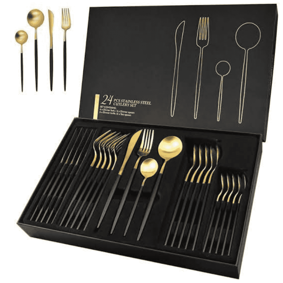 Elevate your dining table in Dubai with this exquisite 24-piece black and gold stainless steel cutlery set. Combining durability and style, this flatware set includes knives, forks, spoons, and teaspoons, all designed with a contemporary aesthetic. Perfect for both formal occasions and everyday use, it comes in a luxurious gift box, making it an excellent gift option.
