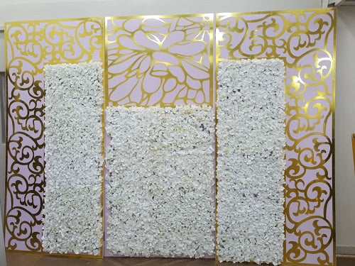 Beautiful Laser Cut Metal Plastic And Polystyrene Back Drop with Plastic Floral Hedges.