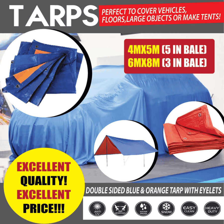 Protect your vehicles, floors, and large objects with our high-quality double-sided tarps. Featuring a robust design with eyelets, these tarps are perfect for outdoor and indoor use. Waterproof, UV-resistant, and rip-resistant, they are ideal for covering items or creating tents. Available in two sizes: Small (4m x 5m, 8kg) and Large (6m x 8m, 13kg), these tarps provide excellent coverage and durability for various needs.