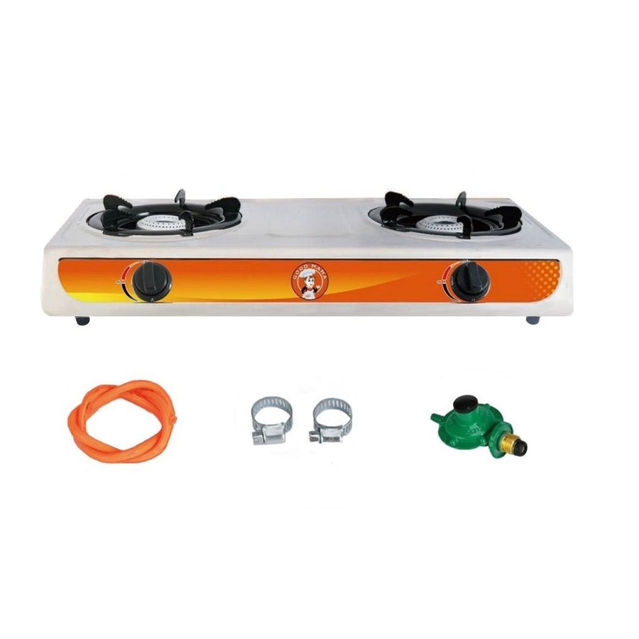 Good Mama Stainless Steel Gas Stove includes cost effective adjustable dual burner plates. Includes rotary adapter, 2 steel rings and quality safety pipe.
