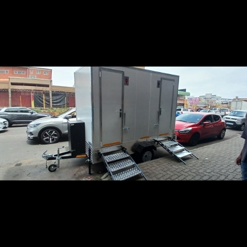Designed for elegance and practicality, it offers two private compartments with ceramic fittings, independent water supply, and solar-powered lighting all in a sleek, sealed unit.