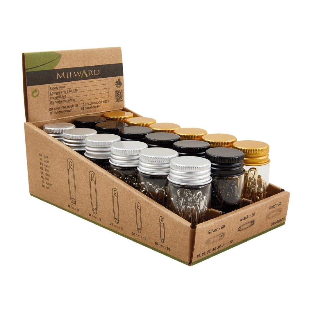 Safety pins made of carbon steel come in black, gold, and silver colors. Each glass jar with a matching metal lid holds 50 pins in assorted sizes of 19, 23, 27, 34, and 38mm (10 of each size). Each jar has a barcode and measures 2.8cm in diameter and 6cm in height (1 1/8” x 2 3/8”).