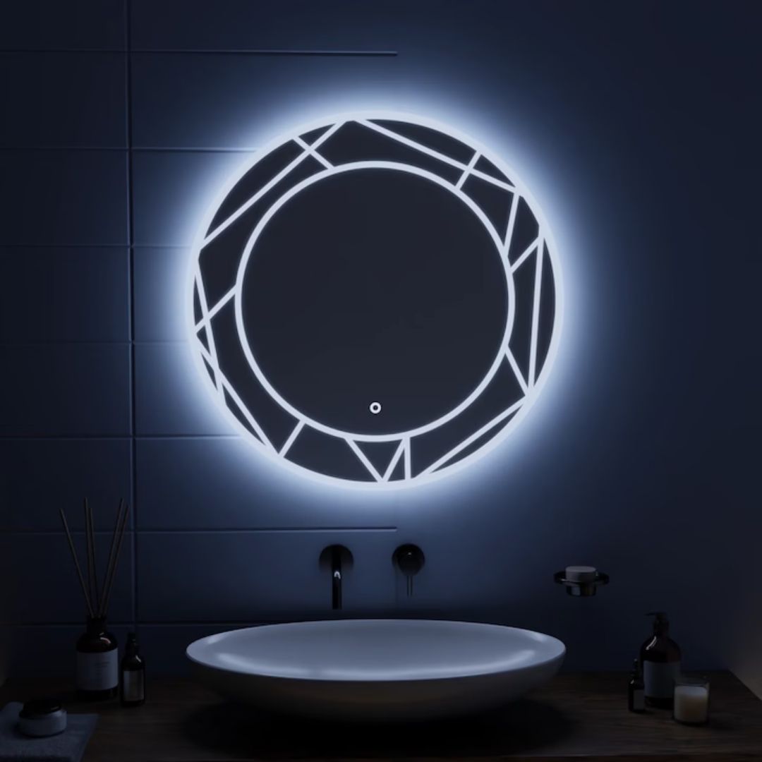 This stylish 60 cm round LED mirror is made with a smooth acrylic frame that gives it a clean, modern look. The acrylic astrix border blends neatly into the mirror, creating a soft glowing edge when the light is switched on. The design is lightweight, durable, and perfect for bathrooms, bedrooms, salons, or dressing tables.